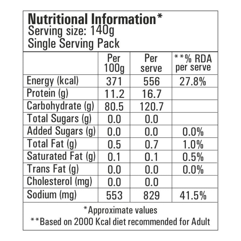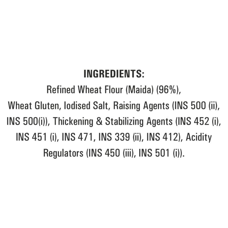 Refined Wheat Flour (Maida) (96%), Wheat Gluten, iodized Salt, Raising Agents (INS 500 (ii), INS 500(i)), Thickening & Stabilizing Agents (INS 452 (i), INS 451 (i), INS 471, INS 339 (ii), INS412), Acidity, Regulators (INS 450 (iii), INS 501 (i)).