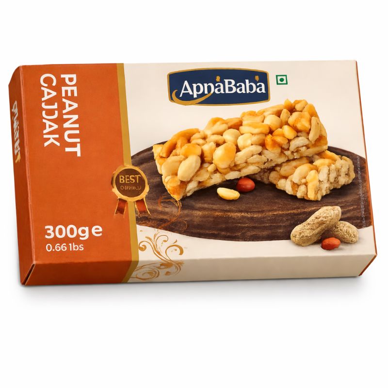 Traditional Indian peanut brittle made with roasted peanuts (53%) and jaggery, blended with sugar and glucose syrup for a crunchy, sweet snack.